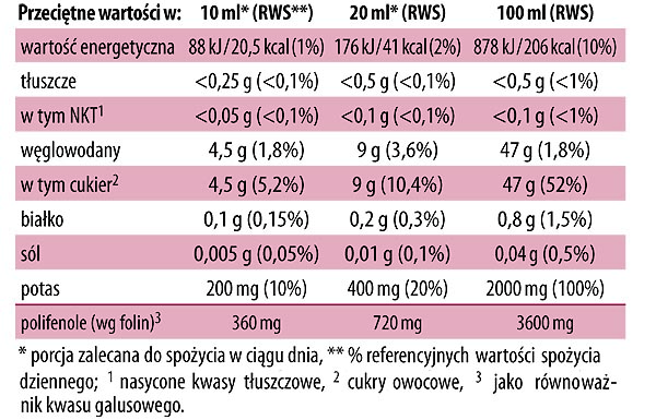 20 ml Eliksiru z granatów zawiera ilość potasu wspomagającą prawidłowe ciśnienie krwi.